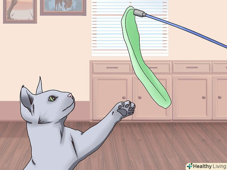 Грайте з кішкою. щоб поспілкуватися з полохливою, але цікавою кішкою, можна запропонувати їй пограти.- Пограйте з кішкою з мітелкою. Волоті, або дражнилки, відмінно підходять для гри з кішками, оскільки дозволяють тримати кішку на відстані, але при цьому захоплюють кішку. Якщо у вас немає дражнилки, візьміть мотузку або зробіть дражнилку з мотузки і довгою палиці.