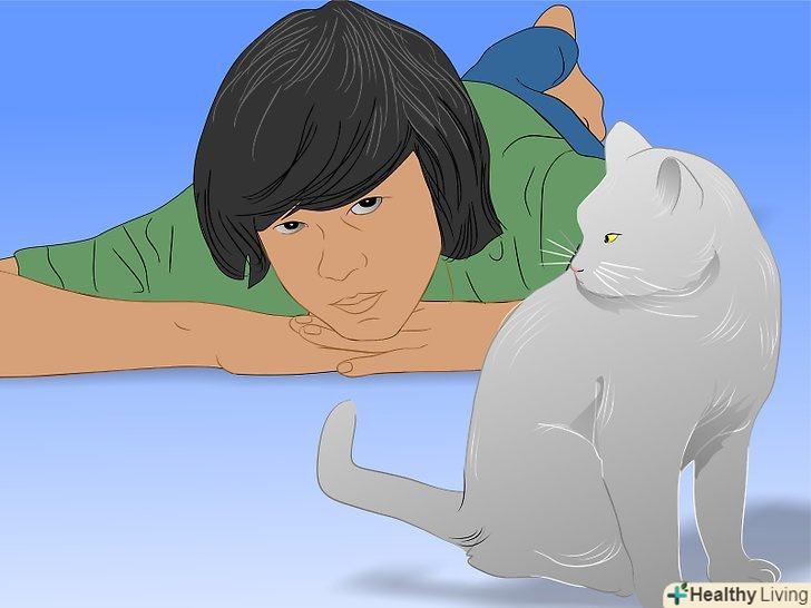 Подумайте про те, щоб лягти на підлогу, щоб не виглядати страхітливо для кота/кішки. це підказка до того, як завоювати довіру кота/кішки: коли тварина зважиться вийти з укриття, ляжте на підлогу.- У повний зріст людина здається коту/кішці страхітливо величезним. Якщо ви ляжете на підлогу, ви будете виглядати менш страшно, і кіт/кішка буде відчувати більшу безпеку, наближаючись до вас.