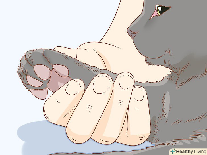 Помасажуйте лапи. коли кішка звикне до дотиків, почніть масажувати лапи пальцями. [2]- Охопіть лапу з двох сторін і помасажуйте її. Виконайте те ж саме з усіма лапами, на яких потрібно підрізати кігті.
