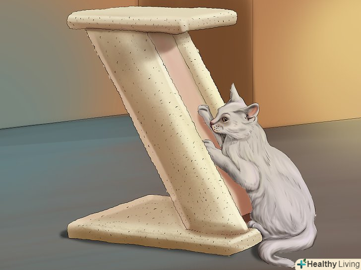 Купіть кішці когтеточку і іграшки. кішки повинні подряпати щось-це важливо для їх психічного здоров'я. Якщо ви не дасте їй когтеточку, кішка буде дряпати меблі та інші речі. Якщо ви де-небудь знаходите кігті, Не турбуйтеся, кішки втрачають старі кігті, а натомість виростають нові, більш гострі. Якщо ви хочете підрізати кішці кігті для безпеки вашої родини та інших, порадьтеся з ветеринаром, щоб не нашкодити кішці або стурбувати її, зробивши це. Підстригати кігті потрібно тільки при необхідності, так як кішки використовують кігті для різних цілей, і їх життя легше, коли кігті гострі і не підстрижені. [14]- Іграшкова миша або інша кумедна іграшка допоможе розважити кішку і дасть їй можливість потренуватися.