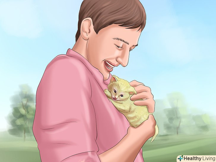 Дозвольте кішці або кошеняті відчувати себе розкуто. використовуйте маленькі шматочки (об'ємом менше кінчика пальця) консервованого котячого корму на кінчику ложки, щоб розташувати кішку до себе. З дуже полохливими кошенятами, що шиплять і тікають, надягайте шкіряні рукавички для захисту рук від укусів. Укутайте кошеня в рушник так, щоб висовувалася тільки голова. Це заспокоїть кошеня і захистить вас від подряпин. [16]- Тримайте кошеня близько до себе, щоб тепло від вашого тіла і серцевий ритм заспокоїли його. Робіть це пару годин в день. Ви зрозумієте, чи досягли Ви результату, коли кошеня почне муркотіти і засне у вас на руках.