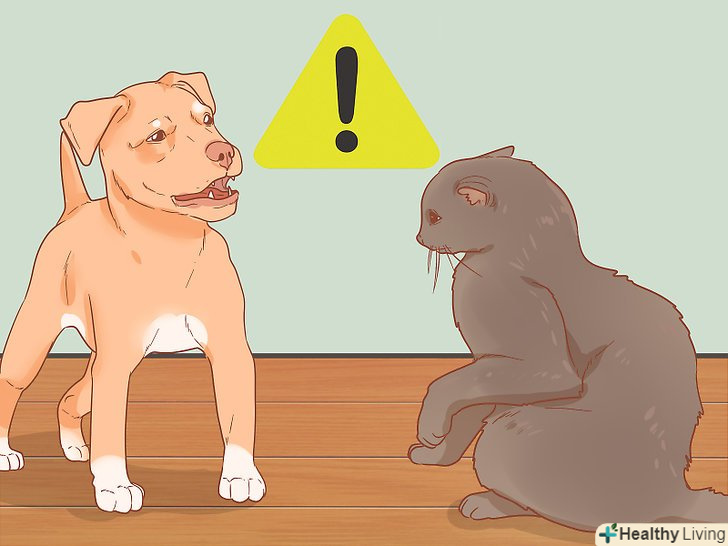 Уважно стежте за появою ознак агресії. за спілкуванням собаки і кішки слід дуже уважно стежити. Агресія може стати серйозною проблемою, крім того, обидва ваших вихованця можуть постраждати через фізичні сутичок. Помітивши найменші ознаки агресії, дійте швидко. [11]- Якщо щеня сконцентрований на кішці до такої міри, що просто не відриває від неї погляду, то це ознака агресії. У кішки ознаками агресії є Рик, шипіння і замахи лапами.