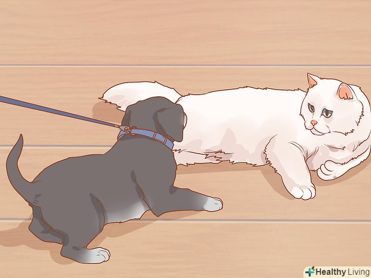 Тримайте цуценя на повідку до тих пір, поки він не почне вести себе абсолютно спокійно. кількість часу, який для цього знадобиться, багато в чому залежить від темпераменту обох вихованців. Деякі кішки і собаки швидко заспокоюються, тоді як іншим потрібно більше часу для того, щоб повністю розслабитися. [9]- Кішка повинна знайти повний спокій в суспільстві цуценя. Вона повинна почати їсти, пити і користуватися туалетним лотком без будь-якого сорому.