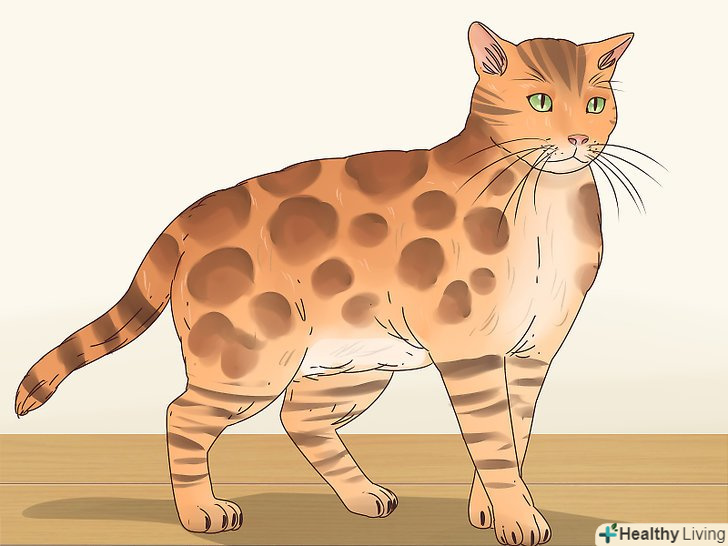 Зверніть увагу на велику м'язисту статуру. бенгальські кішки зазвичай досить великі і стрункі. У них м'язиста статура, і, на відміну від інших різновидів кішок, у них досить рідко з'являється висячий животик, коли вони набирають трохи зайвої ваги. [3]- Дорослі бенгальські кішки зазвичай важать від 3,6 до 6,8 кілограм.
