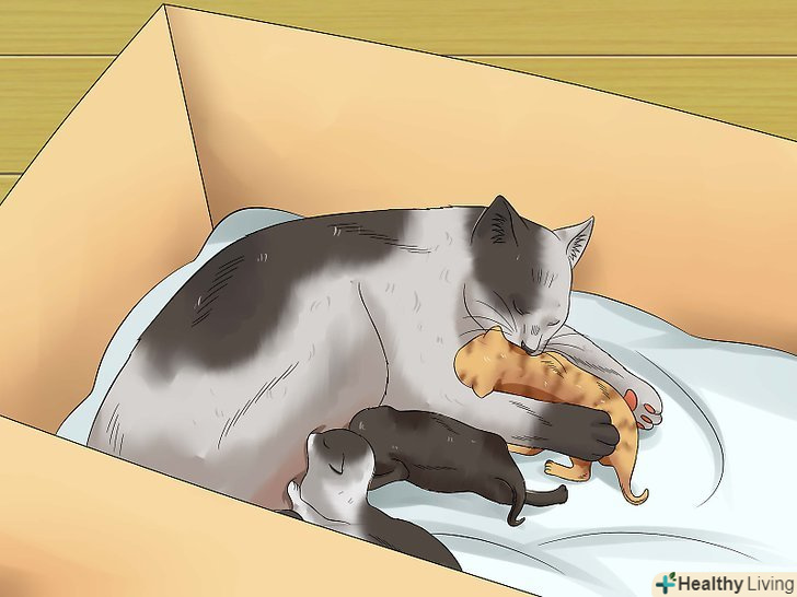 Допоможіть кішці влаштуватися в коробці після пологів. оскільки кішка буде доглядати за кошенятами в перші кілька тижнів життя, вам потрібно буде влаштувати для неї зручне місце. Швидше за все, кішка сама вибере собі місце. Поставте для кішки коробку з чистими і сухими ковдрами в приміщенні, де досить тепло для того, щоб ходити в майці. Місце повинно бути спокійним, щоб повз коробки не ходили люди, інакше кішка не буде відчувати себе в безпеці. [2]- Важливо, щоб температура в приміщенні була комфортною. Якщо в кімнаті буде жарко, кішка буде нервувати, а якщо холодно, кошенята можуть переохолодитися. Новонароджені кошенята беззахисні, вони зігріваються теплом тіла мами-кішки.