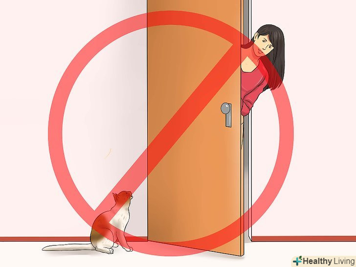 Біля дверей не звертайте уваги на кішку. [1] якщо постійно гладити або грати з кішкою біля дверей, то тварина буде часто проводити там час. Кішка завжди вітає вас після повернення і треться об ноги? Краще не звертайте на неї уваги біля дверей.- Навіть не дивіться на кішку, поки не зніміть взуття з верхнім одягом і не відійдете подалі від дверей. Спробуйте вітати і гладити кішку тільки у вітальні, спальні або коридорі, щоб вона зустрічала вас в тих місцях, де можна задовольнятися вашою увагою.