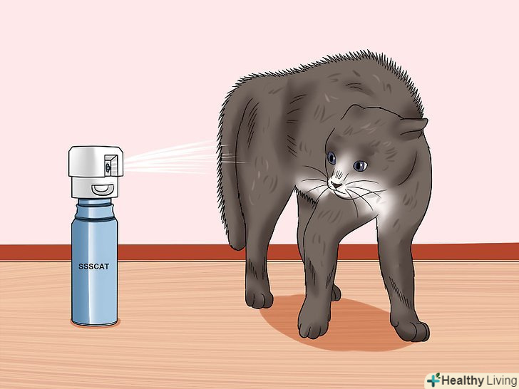 Спрей з відлякуючим запахом або звуковий пристрій. [2] спеціальний невеликий пристрій голосно пищить, коли кіт підходить до дверей. Звук включається завдяки бездротовому датчику, який кріпиться прямо на котячий нашийник. Якщо кіт підійде до дверей занадто близько, то спрацює пристрій і звук відлякає вихованця. Якщо ж він продовжить шлях і не зверне уваги на звук, то отримає слабкий і нешкідливий удар статичною електрикою за допомогою бездротового датчика. Скоро кіт зовсім перестане підходити до дверей.- Спрей з відлякує запахом діє схожим чином. Залиште балончик біля вхідних дверей і включіть. Пристрій почне розпилювати дратівливий, але нешкідливий спрей кожен раз, коли кіт буде підходити до дверей. [3] завжди вимикайте пристрій, якщо не користуєтеся дверима довгий час.