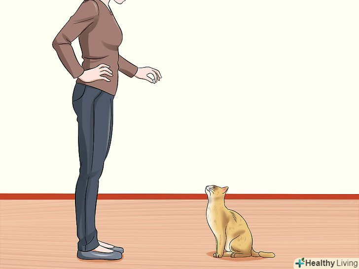 Навчіть кота сидіти. [5] виберіть зручне місце для кота. Можна використовувати кошик або спеціальний будиночок. Перед відходом віднесіть кота в таку кошик або будиночок. Використовуйте ласощі або маленьку іграшку, щоб відвернути увагу кота. Коли кіт присяде або вляжеться, скажіть "сидіти". Говорити потрібно твердо, але без агресії. Повторіть через пару секунд. Повторіть команду приблизно десять разів. Після трьох-чотирьох повторень пригощайте кота ласощами.- Кіт необов'язково повинен саме сидіти подібно собакам. Цілком достатньо, якщо він почне по команді йти в кошик кожен раз, коли вам потрібно піти з дому.