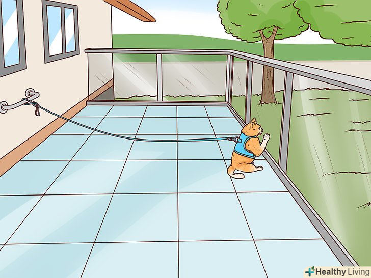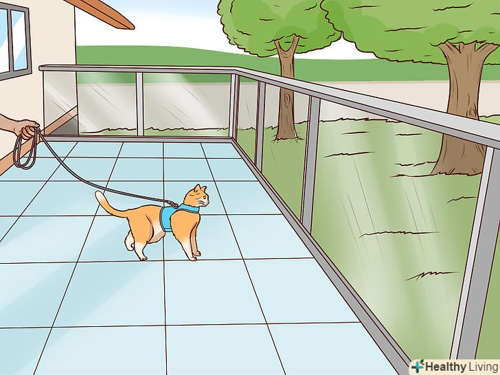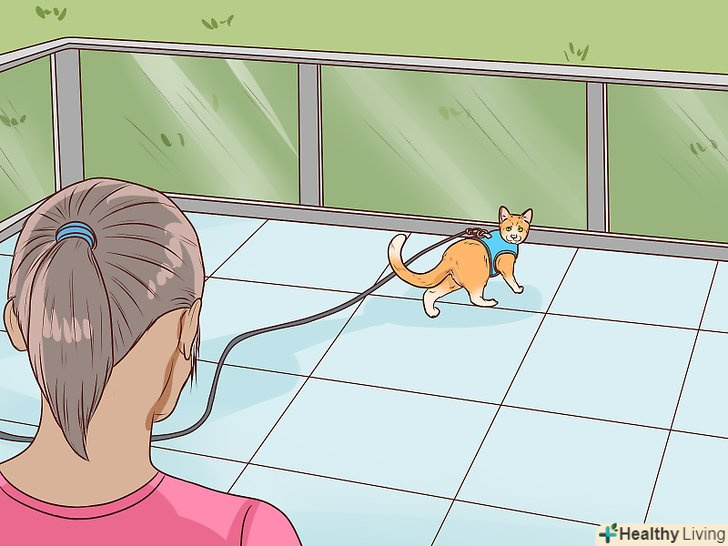 Надіньте на кішку шлею з повідцем і випустіть тварину на балкон. починайте чіпляти до шлеї поводок тільки тоді, коли вихованець звикне і змириться з самою шлеєю. [18]- Надягайте шлею таким чином, щоб вона сиділа на кішці досить щільно, але ви були в змозі підсунути під ремінці пару пальців. Якщо шлейка виявиться занадто вільною, то кішка може вивільнитися з неї. З іншого боку, занадто туга шлейка буде викликати дискомфорт і больові відчуття у вихованця. [19]