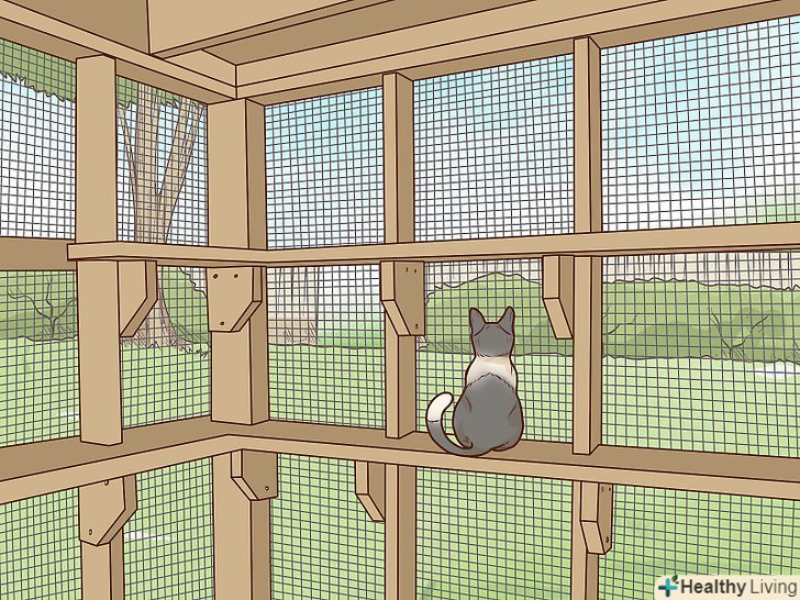 Спорудіть на балконі закритий вольєр для кішки. якщо ви добре володієте різними інструментами і у вас є трохи вільного часу, а також базові матеріали (деревина, металева або міцна пластикова сітка і безпосередньо самі інструменти), то можна самостійно виготовити котячий вольєр. Він може являти собою велику клітку, більш закрите притулок для кішки або довгий прогулянковий тунель. [4] іншими словами, вольєр для кішки може бути настільки простим або химерним, наскільки ви того захочете. [5]- Якщо вам необхідно пошукати натхнення або конкретні інструкції по створенню вольєрів для кішок, а також схеми і фотографії, то все це можна знайти в мережі. Чимало власників кішок, які своїми руками створювали вольєри різних розмірів для своїх вихованців, розміщує в Інтернеті поради щодо виконання робіт, а також фотографії та відеоролики з готовими результатами. [6]