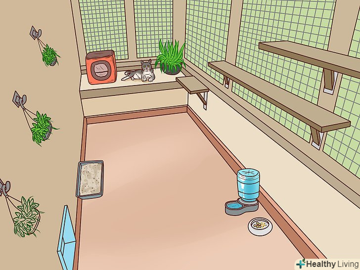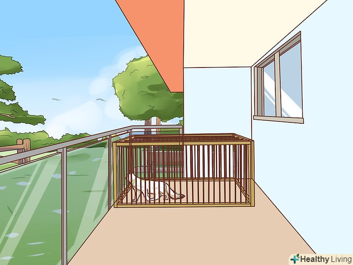 Обшийте балкон пластиковою або металевою сіткою. вважайте балкон не кліткою, а "котячим патіо", що дозволяє вашому вихованцеві безпечно спостерігати за зовнішньою обстановкою і відчувати запахи. Таке облаштування балкона добре підходить для міських жителів і тих, у кого немає приватного будинку з особистої дворової територією, так як воно дозволяє забезпечити домашнім кішкам безпечний доступ до вулиці і свіжому повітрю. [3]- Обшийте сіткою весь периметр балкона, надійно прикріпивши її до поручнів або стійок. Уважно перевірте, що на балконі не залишилося щілин і ненадійних місць, через які кішка може вибратися назовні.