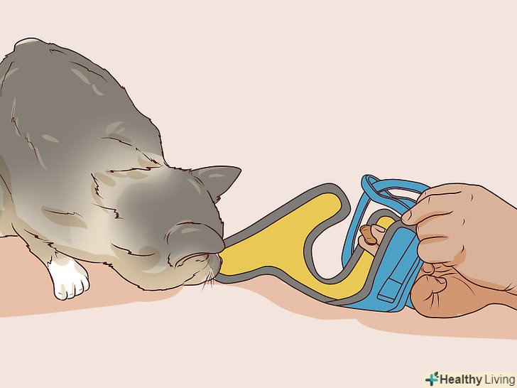 - Починайте періодично надягати шлею (в максимально ослабленому стані ремінців) на кішку і одночасно щедро хваліть вихованця, даючи йому улюблені частування. Через 1-2 хвилини знімайте шлею. Повторюйте процедуру мінімум по два рази на день протягом 1-2 хвилин і поступово збільшуйте час, який кішка проводить в шлеї, перш ніж отримує ласощі і похвалу. Мета полягає в тому, щоб кішка навчилася не звертати уваги на шлею і відчувала себе в ній абсолютно комфортно. [17]