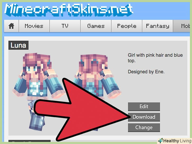 Знайдіть скін.в Інтернеті є багато сайтів, що пропонують величезний вибір скінів для персонажа в Minecraft. Пошуковий запит "скіни Minecraft" надасть вам список сайтів, де вам залишиться відшукати прийнятний для себе скін. В іншому випадку скористайтеся редактором скінів, щоб створити скін самостійно.- Двома найбільш популярними сайтами серед користувачів є Skindex (www.minecraftskins.com) і Novaskin (minecraft.novaskin.me). виберіть бажаний скін і скачайте його на комп'ютер.