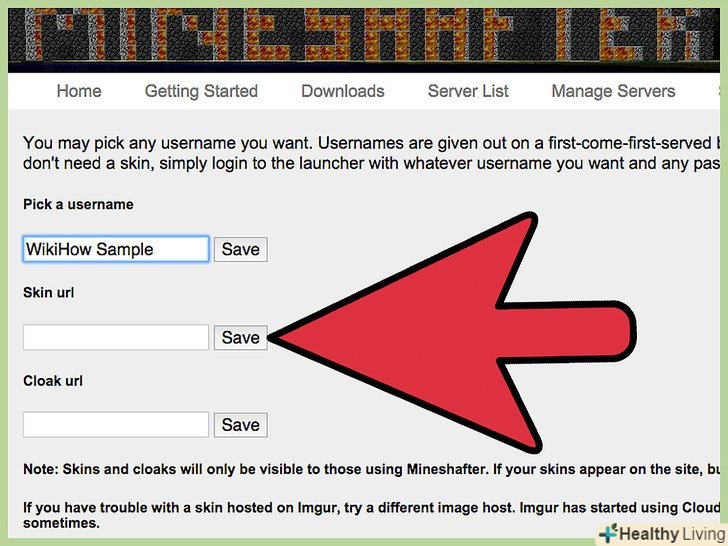Перейдіть на вкладку налаштувань.після входу в Mineshafter, перейдіть на вкладку налаштувань у верхній частині вікна браузера. Тепер введіть інформацію про свій обліковий запис і завантажте .PNG файл скіна.