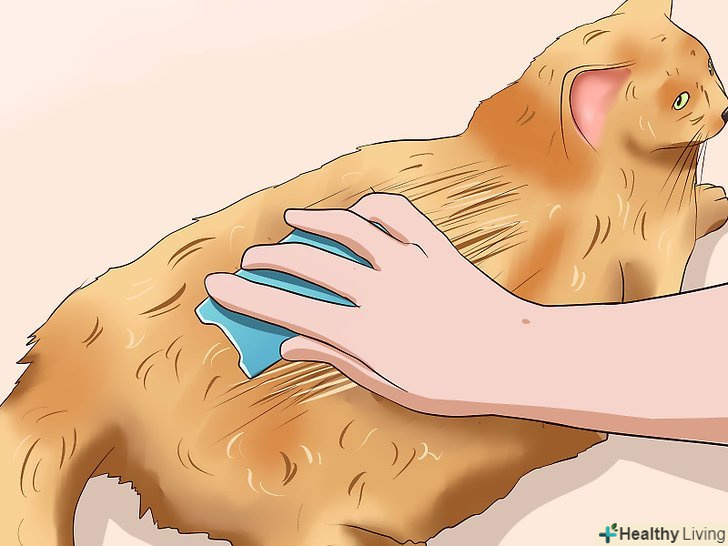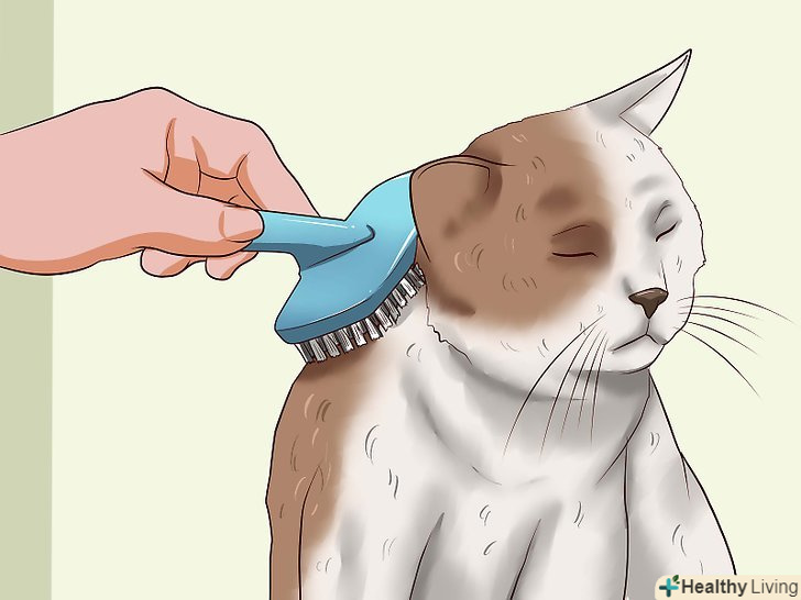 Під час вичісування оглядайте шкіру тварини. пошукайте на шкірі будь-які зміни (ділянки без шерсті, плями, скоринки). Якщо помітите що-небудь незвичайне, відразу ж відвезіть кішку до ветеринара. [7]- Перевіряйте, чи немає у кішки бліх. Розділіть шерсть на проділ і пошукайте дрібних коричневих жучків розміром з кунжутне насіння. Пошукайте і екскременти бліх (вони схожі на дрібні чорні точки). Якщо знайдете що-небудь підозріле, зберіть це вологим ватним диском. Якщо це сліди блохи, вода розчинить кров і навколо плями утворюється помаранчеве кільце.