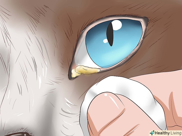 Видаліть скоринки з очей кішки. якщо у кішки є скоринки в очах або якщо у неї сльозяться очі, або є інші виділення, вам потрібно буде очищати область навколо очей. Завдяки цьому кішці буде комфортніше, а очі не будуть дратуватися. Покажіть кішку ветеринару, щоб він оглянув очі. Кішки можуть застудитися і підхоплювати віруси, але все можна лікувати спеціальними препаратами.- Витріть сльози ватним диском або м'якою тканиною.