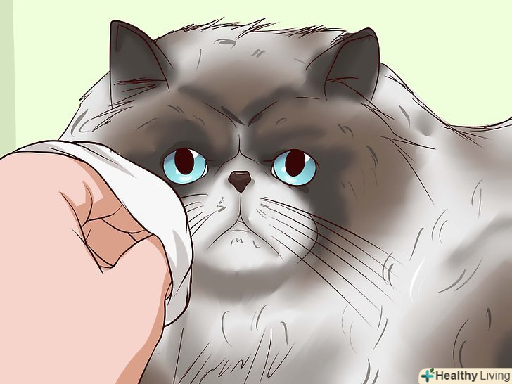 Протріть складки на мордочці. у порід кішок з плоскими мордочками на морді є складки (перські, Гімалайські кішки). Їх потрібно протирати, особливо якщо у кішок підвищено виділення з очей. Сльози та інші виділення накопичуються в складках, через що можуть розвиватися захворювання шкіри. [15]- Візьміть вологий ватний диск або ганчірку і акуратно зберіть бруд в складках. [16]