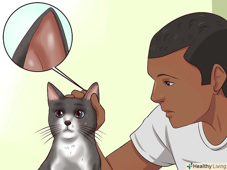 Оглядайте і очищайте вуха. огляньте вуха кішки. Вони повинні бути блідо-рожевими, в них не повинно бути бруду і надлишку вушної сірки. З вух не повинно бути неприємного запаху. Якщо ви не впевнені, здорово вухо чи ні, порівняйте його з другим (вуха повинні виглядати однаково). Якщо одне вухо виглядає по-іншому, це вказує на проблему. Щоб почистити вуха: [17]- Попросіть ветеринара порадити лосьйон для чищення вух (купити його можна буде у ветеринарному магазині).