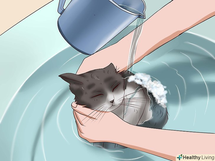 Почніть купати кішку. посадіть кішку в ванну і попросіть помічника взятися за загривок кішки, потім за допомогою чашки або глечика намочіть шерсть тварини. Рухайтеся від шиї до хвоста і не допускайте попадання води в вуха, ніс і очі.- Говоріть з кішкою спокійним голосом, щоб вона не нервувала. Заспокоюйте її і дійте акуратно.