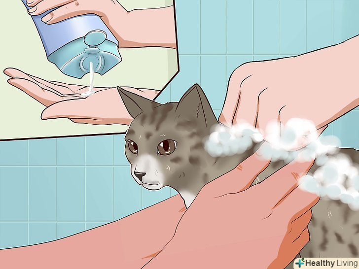 Втирайте шампунь в шерсть кішки. зробіть розчин з однієї частини шампуню і п'яти частин води. Ваш помічник повинен тримати кішку за загривок, поки ви робите це. Вилийте розчин на кішку, уникаючи області очей, вух і носа. Потім акуратно втирайте шампунь в шерсть кінчиками пальців.- Якщо вам потрібно помити область навколо хвоста, зробіть це в латексних або вінілових рукавичках.