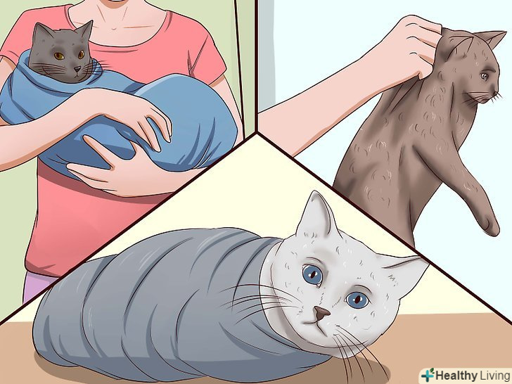 Захистіть себе і постарайтеся заспокоїти кішку. іноді кішку доводиться вичісувати або мити негайно, навіть якщо вона чинить опір. Наприклад, якщо кішка забруднила шерсть екскрементами, її потрібно відразу ж помити, навіть якщо вона проти. Існує кілька способів заспокоїти вихованця і контролювати його поведінку.- Використовуйте рушник . Якщо вам необхідно привести шерсть тварини в порядок, але кішка нервує, загорніть її в рушник, залишивши на волі тільки брудну ділянку. Накрийте очі, щоб кішка не нервувала. Кішка не подряпає вас і не вкусить, тому що кігті і зуби також залишаться під рушником.
