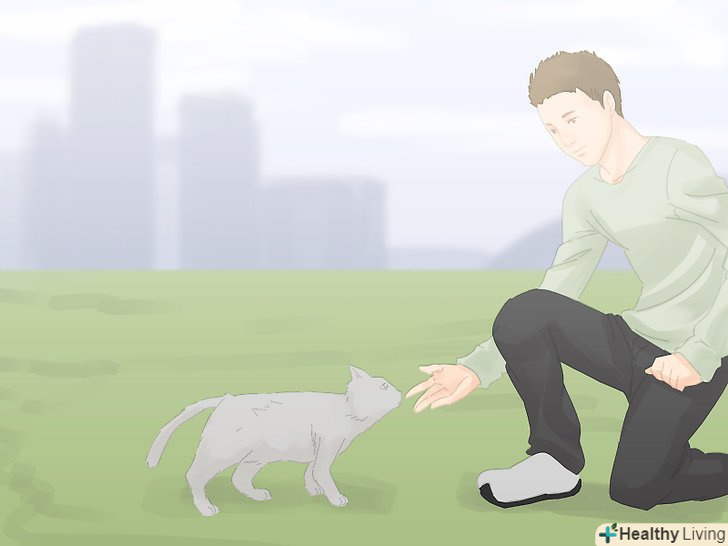 Намагайтеся підібратися до загубився коту якомога ближче (якщо цей кіт дійсно загубився). вам потрібно перевірити його на наявність бліх або ознаки сказу. Підбираючись до тварини, розмовляйте з ним якомога м'якше, можна при Це тримати в руках що-небудь смачне і ароматне – рибу або лівер, наприклад. Якщо кішка полохлива, спробуйте пригнутися якомога нижче, до її рівня. Простягніть до неї руку і покличте солодким голосом.- Спробуйте використовувати різні інтонації, деякі кішки краще реагують на високі тони, інші на низькі або навіть просто на нявкання. Так ви станете для них менш лякаючим об'єктом, і їм буде простіше до вас наблизитися.