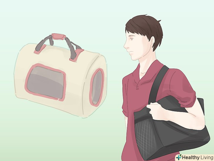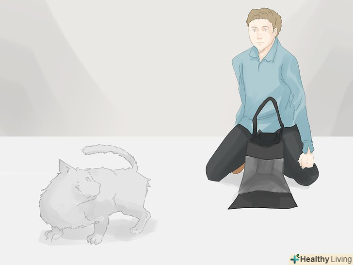 - Підніміть кота на витягнутих руках, тримаючи його якнайдалі від себе, і опустіть задом в переносну сумку. Сумка повинна стояти на боці, щоб ви могли швидко засунути кота всередину і закрити за ним дверцята. Притримуйте дверцята однією рукою, сумку обхопіть ногами, а другою рукою застебніть замок.