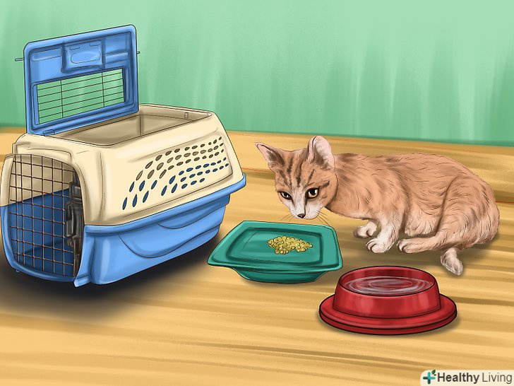 Знайдіть безпечне для кішки простір. якщо ви хочете підійти до цієї справи більш методично і конкретно, можна спробувати наступний спосіб. Почніть з пошуку безпечного і комфортного простору для кішки. Перед тим, як приїдуть гості, підготуйте для кішки затишне спокійне місце, куди вона могла б сховатися від людей і зайвого шуму (наприклад, це може бути переноска для тварин). Принесіть туди мисочки з кормом і водою, а також не забудьте про лоток . Віднесіть тварину в цю переноску (або в інше затишне безпечне місце, яке ви заздалегідь підготували), але не замикайте його. Нехай кішка залишиться там, коли прийдуть гості. Таким чином, кішка перестане асоціювати гостей з тривогою. [7]