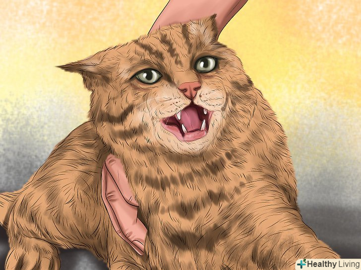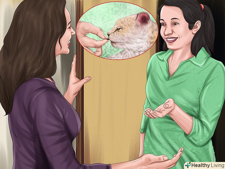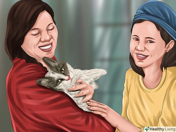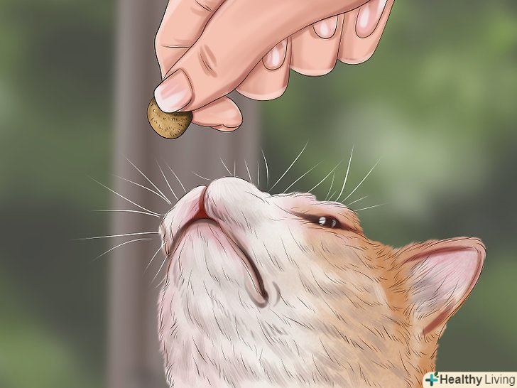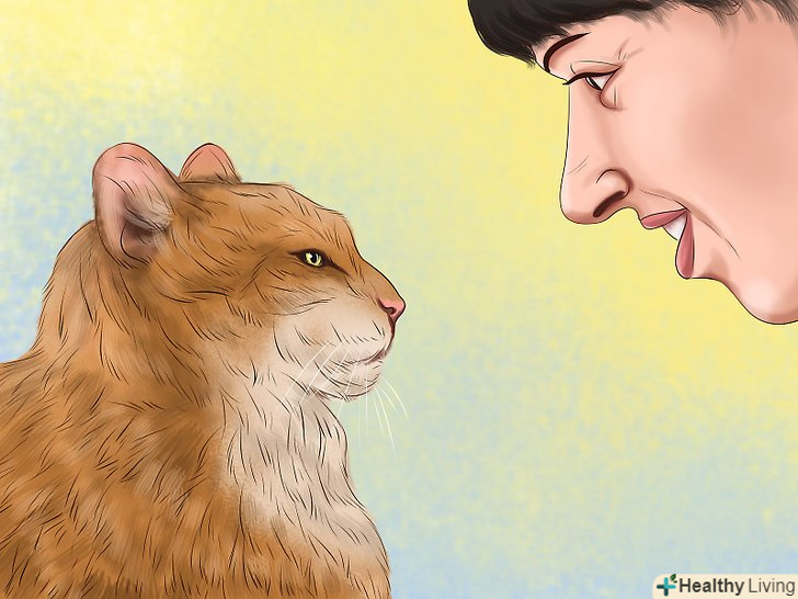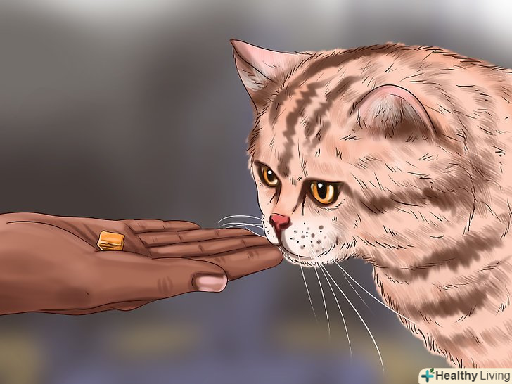 Спробуйте скоротити відстань буквально на кілька сантиметрів. повторюйте цю вправу, уважно спостерігаючи за реакцією кішки. Попросіть гостя рухатися більш повільно і плавно. Йому не обов'язково щось говорити, але якщо він все ж захоче щось сказати, нехай скаже приємним, спокійним голосом. Згодом кішка буде вести себе спокійно, навіть перебуваючи від гостя на відстані витягнутої руки. [10]- Прискорити цей процес допоможуть заспокійливі препарати для тварини.