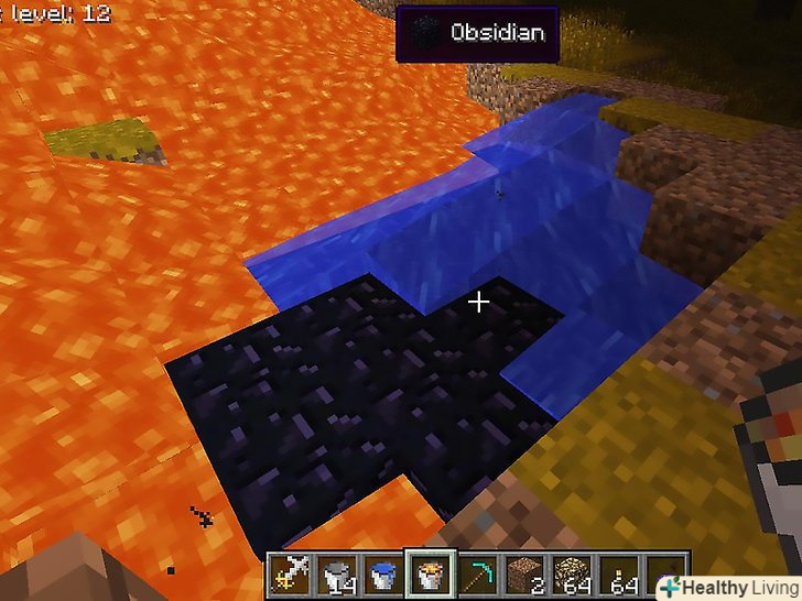 Зробіть так, щоб вода потекла на лаву.покладіть блок води над лавою (на один блок вище лави). Вода потече вниз, і поверхня лавового озера перетвориться на обсидіан.