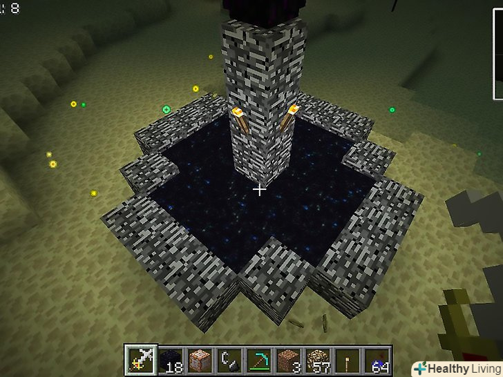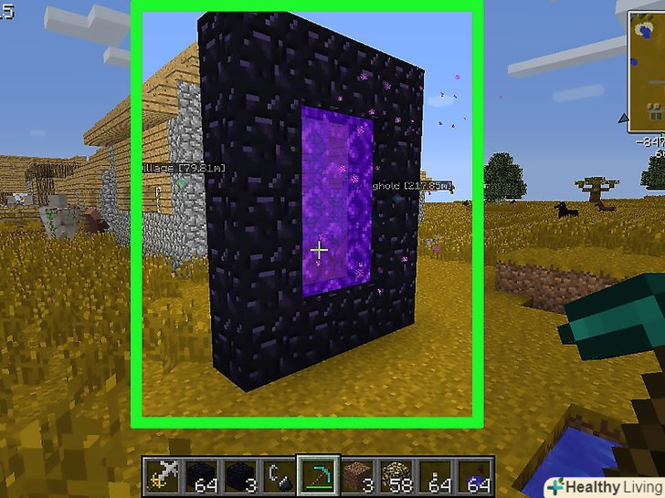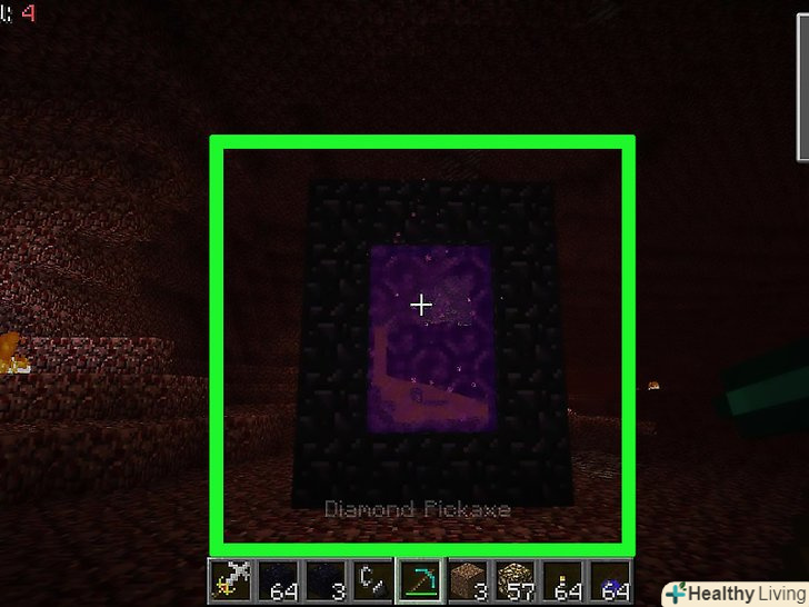 Створіть портал Нижнього світу.для цього побудуйте рамку з п'яти обсидіанів по вертикалі і чотирьох по горизонталі. Тепер активуйте портал за допомогою кресала на блоці обсидіану, який знаходиться в самому низу. Можливо, це не спрацює, якщо поблизу вже є затиснутий портал.[5]- В кутах рамки обсидіан можна не ставити.