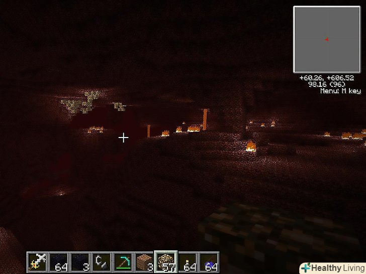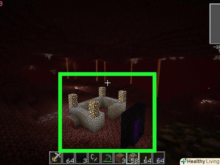 Перейдіть до Нижнього світу. це небезпечне місце, тому підготуйтеся, якщо ще ніколи там не були. Візьміть з собою залишилися десять обсидіанів, але рекомендуємо залишити їх в надійному місці і спочатку знайти безпечний маршрут. Необхідно пройти мінімальну відстань по прямій горизонтальній лінії (про всяк випадок наведені цифри включають запас в 3 блоки):[6]- Великий світ на комп'ютері, мобільному пристрої та ігрової консолі: пройдіть 19 блоків.