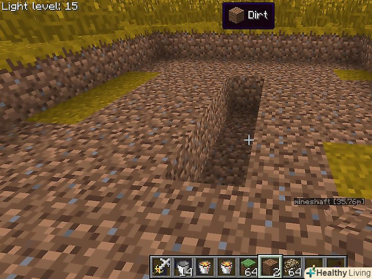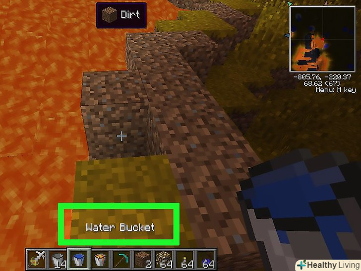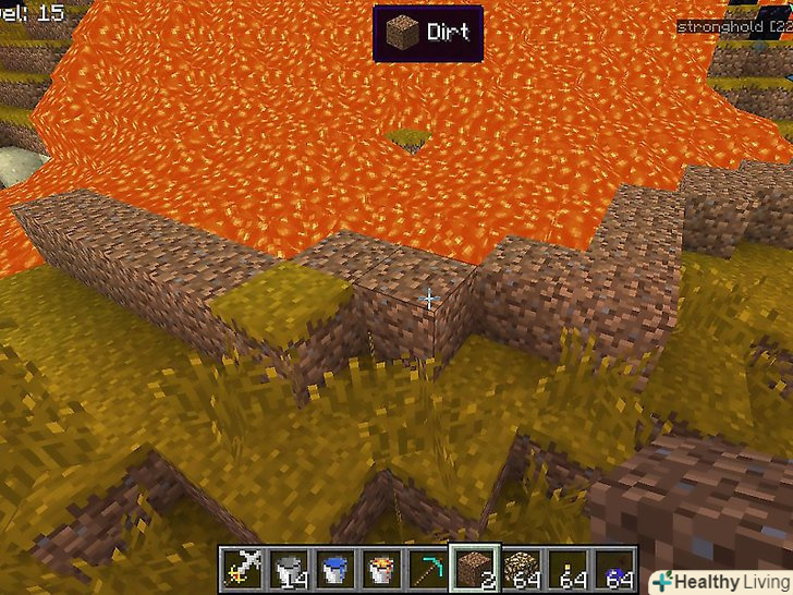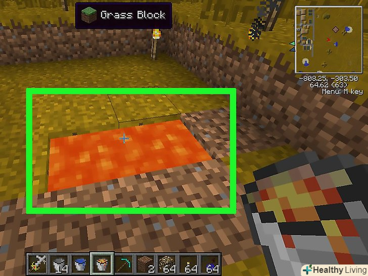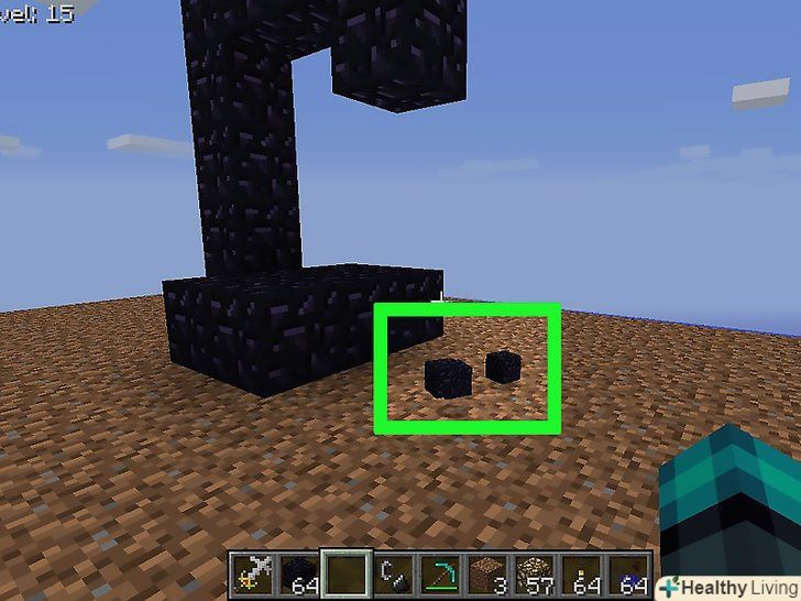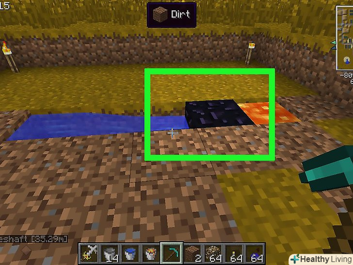 Викопайте яму там, де повинен з'явитися обсидіан.переконайтеся, що яма закрита з усіх боків (крім верху) і що в радіусі двох блоків немає нічого легкозаймистого. Дерево, висока трава та інші об'єкти можуть спалахнути біля лави.[4]