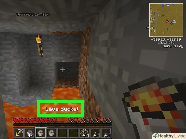 Спробуйте добути один блок обсидіану.зробіть це за допомогою алмазної кирки. Можливо, під цим блоком буде лава — постарайтеся не впасти в неї. Також обсидіан може впасти в лаву до того, як ви візьмете його (в цьому випадку обсидіан згорить в лаві).