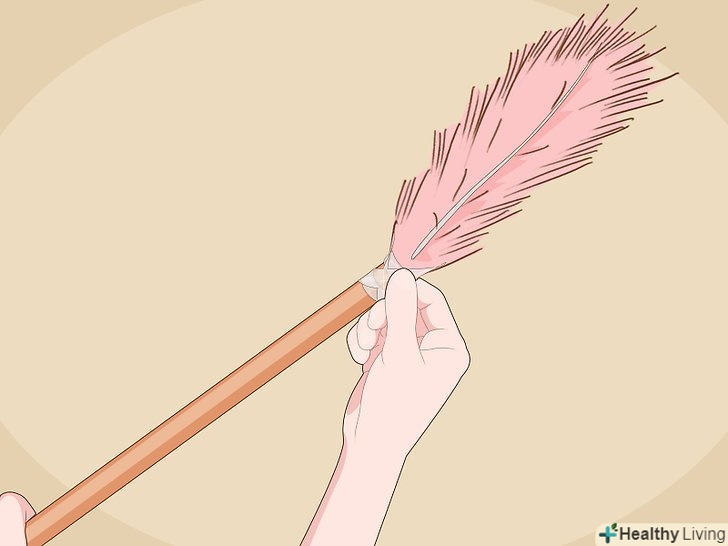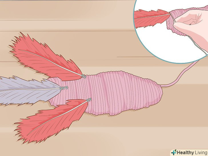 Прикріпіть невеликий пучок пір'я до палички. їх можна прикріпити як безпосередньо до самої паличці, так і до закріпленого на її кінці кульці. Кішкам подобаються іграшки з пір'ям, так як вони нагадують собою пташок, які є природною здобиччю кішок. [10]- Приклеюйте пір'я найнадійнішим клеєм, який у вас є, але знайте, що, якщо кішка відгризе надлишки клею, вона може завдати серйозної шкоди своєму здоров'ю. З цієї причини можна спробувати прикріпити пір'я до палички за допомогою скотча.