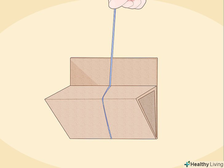 Складіть картонку навпіл і зробіть в згині дірочку для мотузочки. пропустіть мотузочку крізь зроблене отвір, щоб можна було надійно закріпити картонку на її кінці. Іграшка на даний момент вже повинна почати нагадувати маятник, яким ви будете розмахувати перед своєю кішкою.