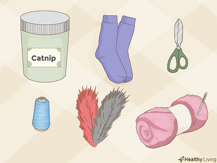 Підготуйте матеріали. вам буде потрібно пухнаста пряжа, носок, ножиці, котяча м'ята, кілька пір'я, голка і нитка.