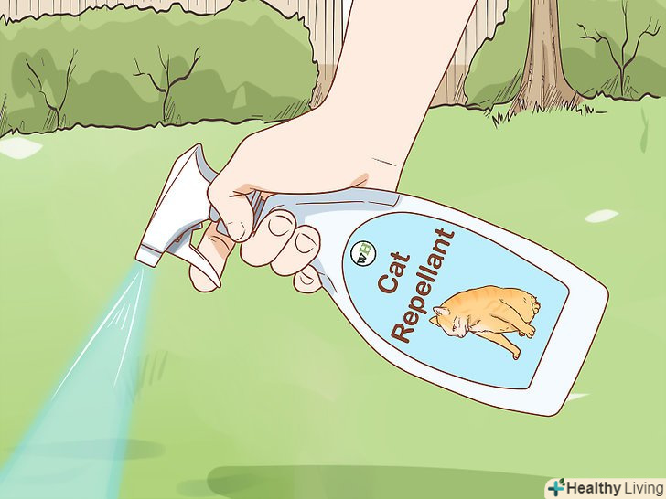 Обробіть свій двір спеціальним котячим репелентом. різні компанії випускають спеціальні хімічні відлякуючі засоби для кішок. Вони містять особливі інгредієнти (будь то натуральні або синтетичні), які виділяють неприємні для кішок запахи. Дотримуйтесь вказівок на упаковці обраного Вами засобу щодо частоти його застосування. Обробляйте репелентом ті ділянки двору, де кішки зазвичай проводять свій час. [3]- Репеленти від кішок можна придбати в більшості зоомагазинів, а також в господарських магазинах.
