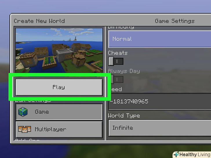 НатиснітьСтворити.ця кнопка знаходиться на лівій стороні екрана. Буде створено новий світ на основі обраного шаблону села.