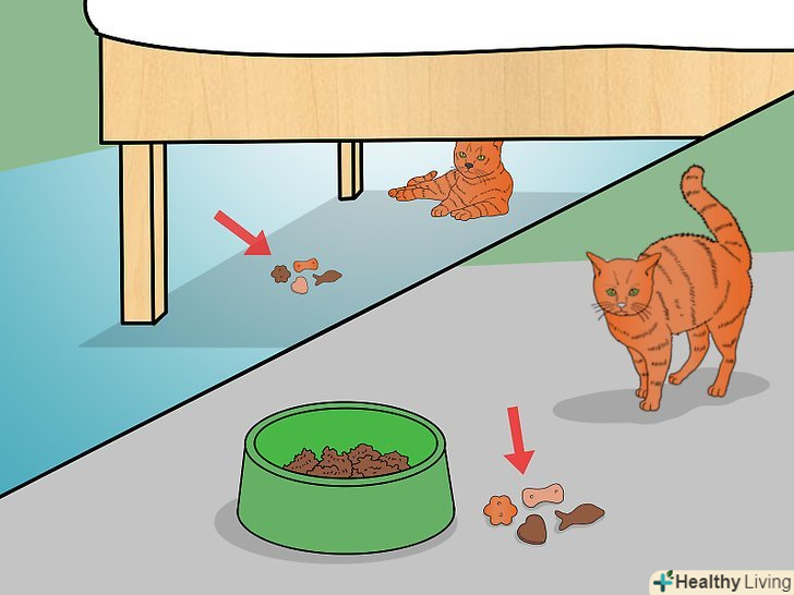 Додайте ласощі в котячий корм. візьміть три-п'ять шматочків ласощі і покладіть їх прямо на порцію корму під час годування. Якщо кішка вибаглива і не любить, коли корм змішаний з ласощами, покладіть його поруч з мискою.