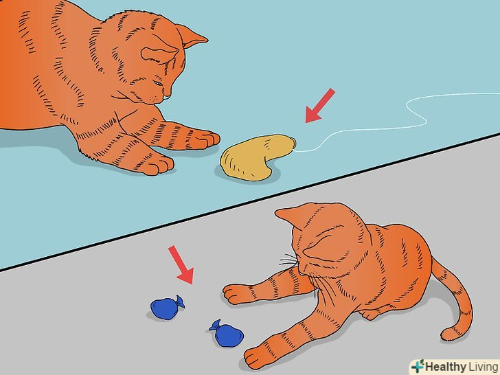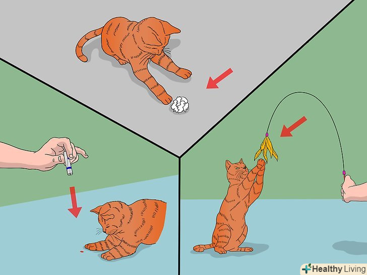- Пограйте з кішкою пір'яний дражнилкою. Дражнилка для кішок-це така довга і гнучка паличка, з одного кінця до якої прикріплені пір'я або нитка. На деяких дражнилках є дзвіночки. Поводьте перед лапами кішки тим кінцем дражнилки, де є іграшки. Акуратно змахніть дражнилкою, і кішка навіть може підстрибнути, намагаючись зловити іграшку.