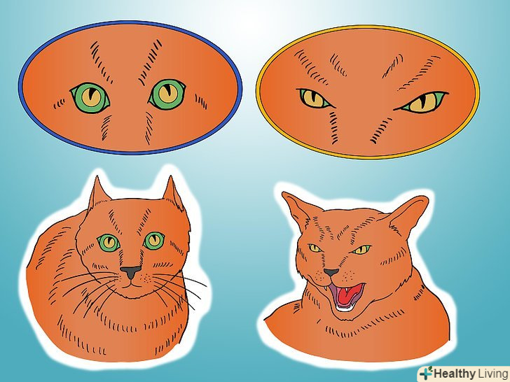Зверніть увагу на очі кішки. очі кішки чітко реагують на зміни в освітленні, але також передають і настрій. Коли стежите за очима кішки, приймайте до уваги і ступінь освітленості приміщення, і мову її тіла. Ось кілька ознак: [10]- Якщо зіниці кішки розширені, вона може бути налякана, але так буває і тоді, коли в приміщенні темно.