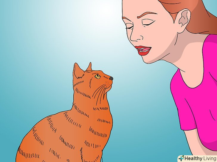 Поговоріть з кішкою. скажіть їй: «Прости мене». Ви навіть можете назвати кішку по імені. Переконайтеся, що Ваш голос звучить м'яко і спокійно; використовуйте трохи більш високий тон, ніж зазвичай. [1] хоча кішка і не зрозуміє ваших слів, вона зрозуміє ваш тон. Не кажіть гучним, пронизливим голосом: у кішок дуже чуйний слух, і таким чином ви тільки викличете роздратування.- Спробуйте повільно моргати. Кішка, яка довіряє вам, моргає повільно. Роблячи так само, ви покажете кішці, що довіряєте їй. [2]