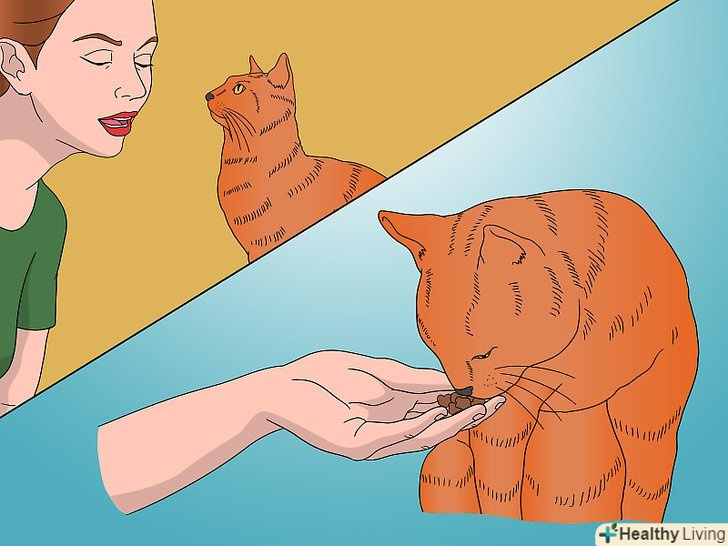Почастуєте кішку ласощами. [5] якщо кішка дозволяє до себе підійти, ви можете дати їй ласощі особисто. Візьміть в долоню три-п'ять шматочків ласощі і опустіться на коліна поруч з кішкою. Якщо кішка готова вас пробачити, вона підійде і почне їсти частування. В цей час можете спробувати погладити кішку за вухом або там, де вона любить. Якщо кішка до вас не підходить, покладіть ласощі на підлогу і відійдіть. Не забирайте ласощі, це тільки засмутить кішку.- Ласощі для кішок можуть бути різними за консистенцією: м'які жувальні, сухі хрусткі, хрусткі зовні і м'які всередині, схожі на в'ялене м'ясо, сублімовані. У відділі котячого корму магазину для тварин навіть можна знайти сухі тунцеві пластівці.