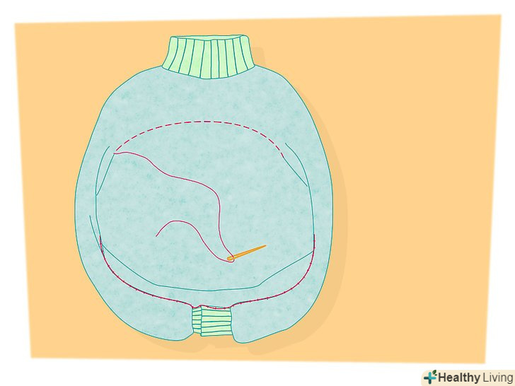 Розкладіть светр на плоскій поверхні. Якщо светр вовняний, то його попередньо слід зваляти (див.поради). За допомогою пряжі голки пришити шви рукавів до боків светри приблизно до середини довжини рукава від пахви (для наочності показано контрастним кольором пряжі).