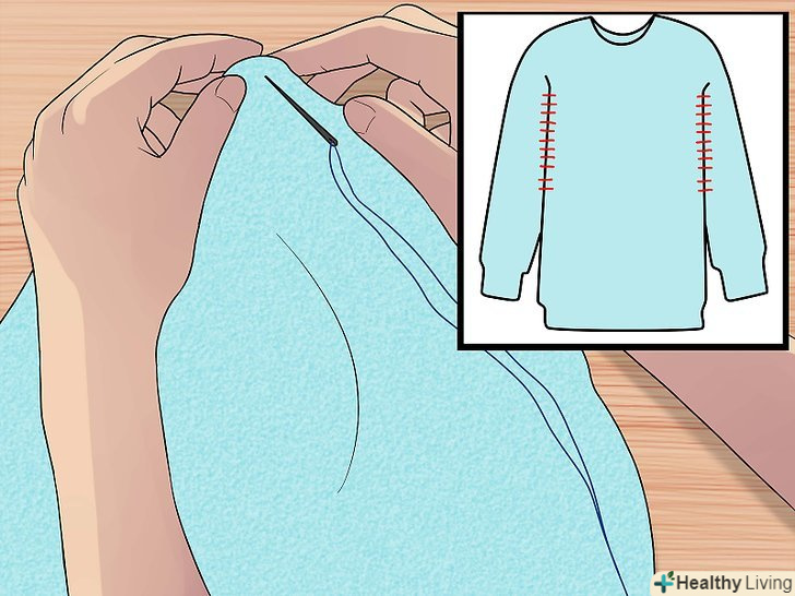 Пришийте часткові шви рукавів до боків светри. для цього вам буде потрібно лише пряжа і циганська голка. Можна використовувати в роботі пряжу контрастного кольору (наприклад, червону пряжу для чорного светра) або взяти нитки в тон речі, щоб зробити стібки невидимими.- Зупиніться, коли ви спуститеся від пахв вниз приблизно до середини довжини рукавів.