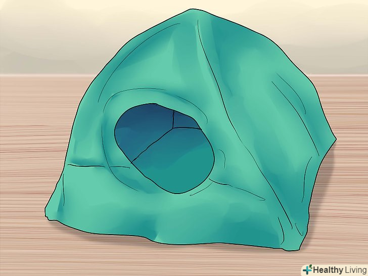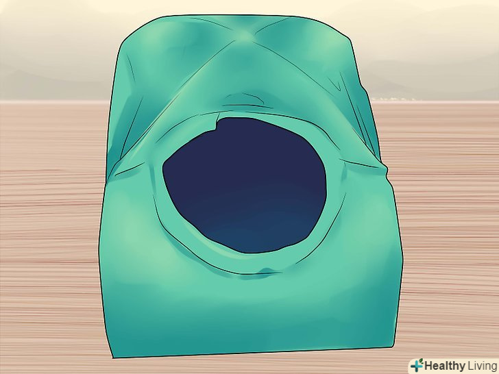Натягніть на каркас футболку. Футболка стане тентовим покриттям. При цьому вона повинна бути досить просторою, щоб її можна було вільно надіти на каркас. Це дозволить вам згодом без праці туго натягнути тканину і зробити для кішки досить затишний будиночок.- Надіньте футболку на каркас тенту таким чином, щоб проріз горловини виявилася спереду по центру. Це буде вхідний отвір.