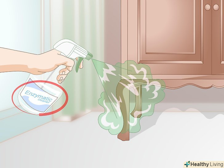 Нанесіть миючий засіб. у продажу є безліч засобів, які допомагають позбутися від запаху котячої сечі. Необхідно вибрати засіб без нашатирного спирту, тому перед покупкою ознайомтеся зі складом. Запах нашатирного спирту може привчити кішку повторно позначати дане місце. [2]- Виберіть ферментний миючий засіб. У продажу є різні марки ферментних чистячих аерозолів. Вони ефективно розщеплюють речовини, які містяться в котячій сечі і надають їй стійкий запах.