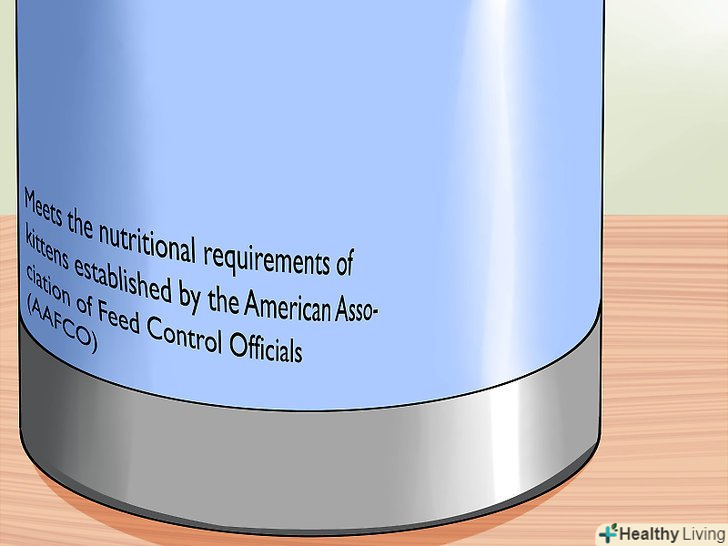 Вибирайте якісні продукти. більшість ветеринарів не рекомендують купувати продукти від невідомих виробників або продукти магазинних торгових марок. Краще купувати продукцію відомого виробника кормів для кошенят, оскільки корисність таких продуктів зазвичай підтверджена дослідженнями. Якщо ви не розбираєтеся в виробниках, то можна запитати про них у ветеринара. [3]- На упаковці повинна бути наступна напис: «відповідає харчовим потребам кошенят, встановленим відповідною організацією». Не купуйте продукти без такого напису.