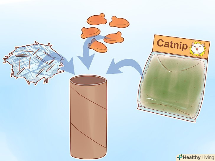 Спокушайте кішку ласощами. Візьміть рулон паперових рушників і помістіть в нього трохи нарізаного паперу, додавши туди ласощі, і, можливо, котячої м'яти. Спостерігайте, яке задоволення відчуває кішка, намагаючись пробратися всередину, щоб отримати ласощі. [18]